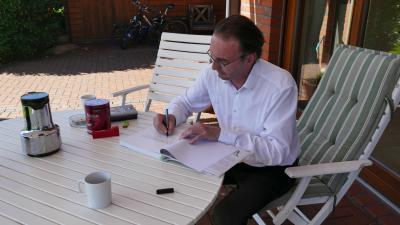 auf der Terrasse des Meisters sitzend.