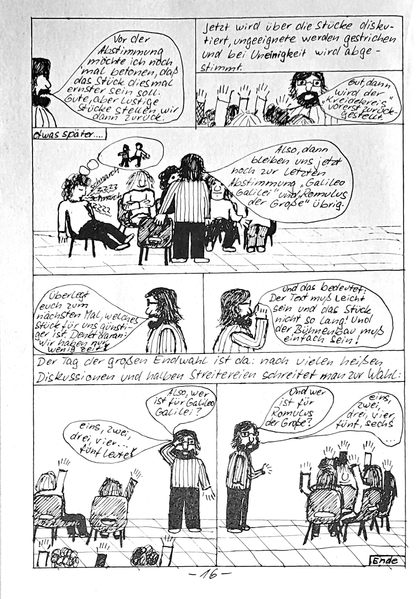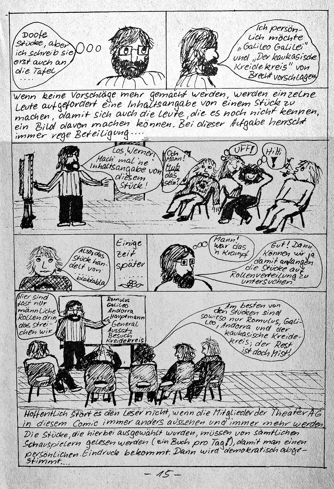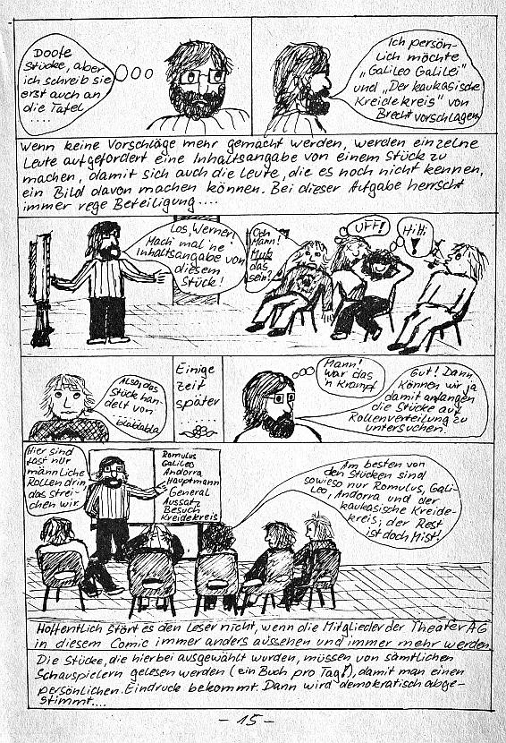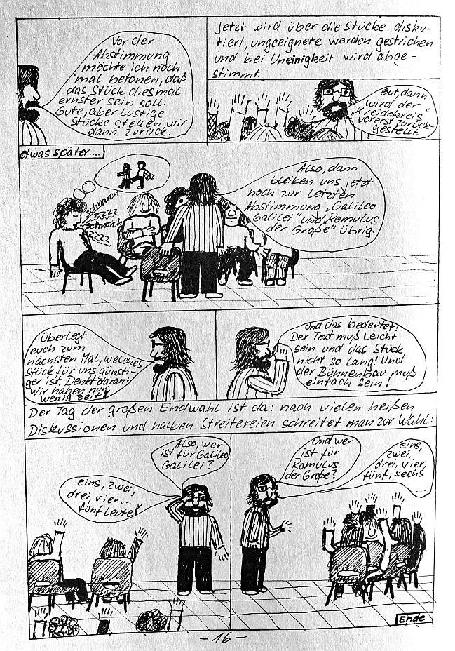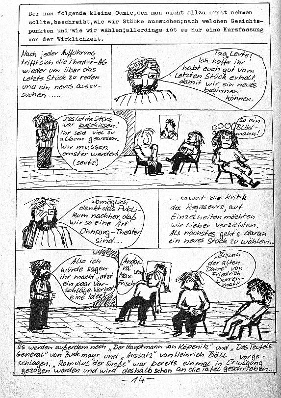 beim letzten mal den rest weggelassen, der nun kommt: 2. Teil (4) des Auszugs aus der Schülerzeitung "Die Wühlmaus" Nr. 52 (1992) "Bevor Werner die Schule verließ, wollten wir noch ein Stück mit einer Hauptrolle für ihn aufführen. Extra für ihn! Jeder, der jemals in der Theater-AG war, weiß, wie schwierig die Besetzung eines Stückes ist; und diejenigen werden besonders klar sehen, was es bedeutet, dass wir alle eine wichtige Rolle für Werner wollten. Das zeigt jedem, dass Werner eben nicht nur ein guter Schauspieler, sondern auch ein akzeptierter Mensch war. Wir entschieden uns für ..." R O M U L U S der Große von Friedrich Dürrenmatt es folgt der comic aus dem programmheft, in dem dieser auswahlprozess dokumentiert wird: Zum Vergrößern auf das Bild klicken!