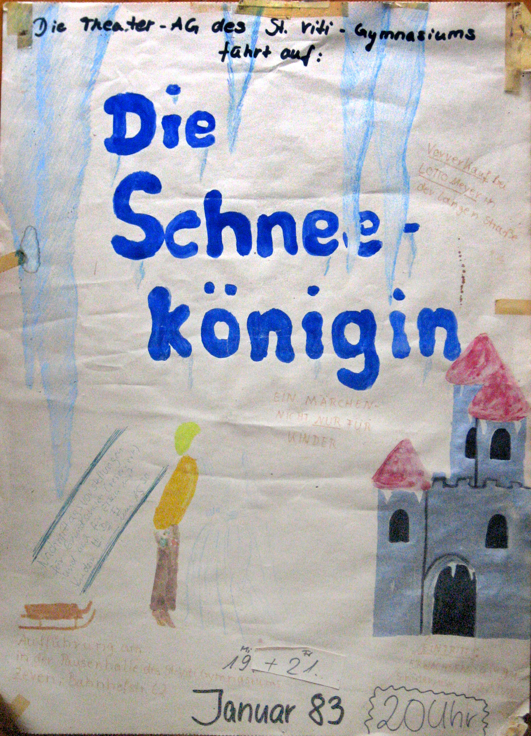 an." (wuehlmaus 52/1992) kate bush ist so gewandet wie die schneekönigin eigentlich sein sollte: schwarz, unsere schneekönigin war ganz "in weiß". und wieder erlebten wir ein abenteuer, aber davon war am anfang keine spur zu sehen. nach romulus wollten wir irgendetwas ganz anderes machen. ein dritte-welt-stück war im gespräch, das erarbeiteten wir später, führten es aber nie auf. (ich gehe später noch drauf ein.) aber da entstand langsam ein gedanke, der sich entwickelte, so wie eine lawine in das tal rollt: ein kinderstück! ja, wir wollten etwas für kinder machen, mit nachmittagsvorstellungen. beim suchen stießen wir auf das theaterheft der schneekönigin von jewgenij schwarz nach dem märchen von hans christian andersen. Die Schneekönigin ist ein Kunstmärchen des dänischen Dichters Hans Christian Andersen, eines seiner längsten und ausgefeiltesten sowie kompliziertesten und vielschichtigsten. Es handelt von einem kleinen Mädchen, das seinen von der Schneekönigin entführten Spielgefährten sucht. (wikipedia) als wir