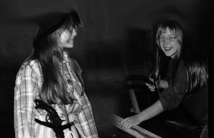 "Wenig Schwierigkeiten hatte Bernd S., sich mit der Rolle des Rats zu identifizieren. Wir alle waren total begeistert über das wahnsinnig(e) (tolle) Lachen, das er ohne zu üben sofort drauf hatte. Selbst bei privaten Gesprächen beginnt er bzw. beginnen andere, (sich), ihn dabei zu ertappen, den Worten "Dummes Zeug" hinzuzufügen. vom rat hören und sehen wir später. Auch die Rolle der kleinen Räuberin wurde mit Alex richtig besetzt. Sie konnte ihre Art total beibehalten, musste nur noch brutalere Züge annehmen (diese entsprachen wirklich nicht ihrem Wesen!!!)" rechts beim sägen und links in voller "montur".