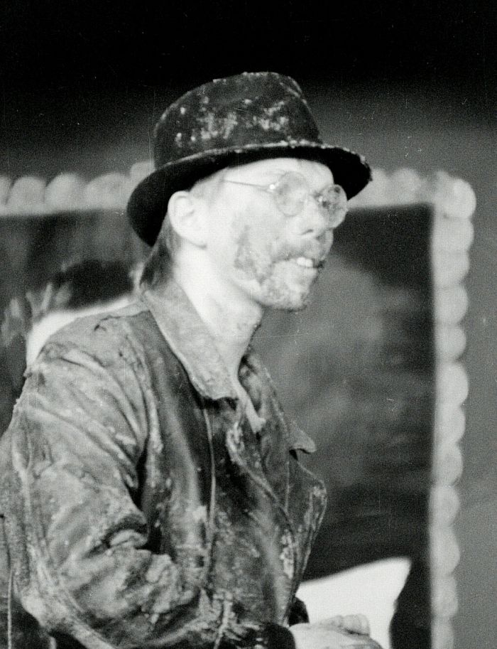 eine kleine anekdote, erlebt wahrscheinlich bei der generalprobe ... einige schüler haben etwas zugeschaut und einer sagte: "der stottert ja so - der kann seine rolle gar nicht." ich hört es, ging zu ihm und erzählte ihm folgendes: das ist volker, der im letzten stück den märchenerzähler gespielt hat, eine sehr schöne und wichtige rolle. jetzt spielt er einen versoffenen penner und er spielte seine rolle so gut, sodass viele das gar nicht mitkriegten: sich zu verhaspeln, zu stottern, manchmal gar nicht richtig sprechen zu können, das war die Rolle von Jakob Nebel.
